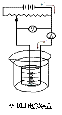 电解是在外电源作用下非自发进行的、物质在电极上发生氧化还原反应而引起物质分解的过程。现以电解CuSO4溶液为例来说明电解过程。图10.1是电解装置,电解液为0.5 mol·L-1 H2SO4–0.1