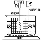 控制电流电解是在电解过程中不断地调节外加电压,使通过电解池的电流恒定在0.5~5A范围内进行电解。其装置如图10.3所示。以串联的蓄电池为直流电源,电源通过可调电阻与两电极相连。电解池中使用的电极系统如图10.4所示。阴极为网状铂电极,网状铂电极具有较大的表面积,在允许的电流密度下可以使用较大的电解电流,以加快电解速率。另外,网状铂电极也有利于溶液的搅拌,较小浓差极化。阳极一般为螺旋状铂电极。电解时,将阳极插在阴极中间,并转动阳极起搅拌作用。