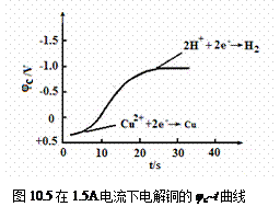 在上述的电解硫酸铜溶液例子中,阳极的过电位ηa为0.72 V,铂阴极的过电位ηc忽略不计,根据式(10.4),计算电解时外加电压值为: