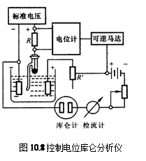 在控制阴极电位电解过程中,要随时测定阴极电位,随时调节电压以控制阴极电位为一恒定值。图10.6是机械式自动控制阴极电位电解仪。甘汞电极和阴极组成的原电池与一个电位计反向串联。调节电位计的输出电压使之与设定的阴极电位(相对于甘汞电极)相等。例如,如果要把阴极电位控制在-0.35 V,则电位计的输出电压就调节到0.35 V。在电解过程中,只要阴极电位保持在-0.35 V,标准电阻R就没有电流通过,当阴极电位偏离所需的电位值时,就有电流通过电阻R,R上的电压经放大器放大后,驱动可逆马达调节R′,控制电解池的外加电压,使阴极电位回到应该控制的数值(-0.35 V),这样就实现了阴极电位的自动控制。