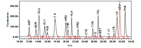 仪器与试剂:Waters2695型高效液相色谱仪(主要包括2487双波长紫外-可见检测器,2695二极管阵列检测器,柱温箱,自动进样器,自动脱气四元梯度泵等),Acc Q. Tag氨基酸测定试剂盒:包括Acc Q-FlourTM氨基酸衍生剂,衍生剂稀释液,17种混合氨基酸标准溶液。