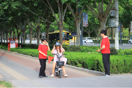 西门与北门门口,一场“交通安全,从‘头’开始”的校园交通安全督导活动正在如火如荼地进行着。实践团成员们不畏酷暑,用汗水换来了师生们对“一盔一带”的深刻理解与遵守。