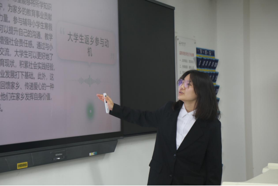 答辩过程中,各成员通过PPT的形式,依次上台展示,学生们自信从容,紧扣主题,条理清晰的阐述项目思路,并对项目结果进行总结与反思。水产养殖学2024级1班的杨文毓同学在实践后感慨良深:“躬行实践,方能致远。社会实践是青年学子锤炼本领、服务社会的重要桥梁。得益于这次‘返家乡’社会实践,我从最初的手足无措到后来能够自信从容地参与基层服务和调研工作,这段充实的经历让我受益匪浅,也让我更加坚定了投身家乡建设的信念与决心。”
