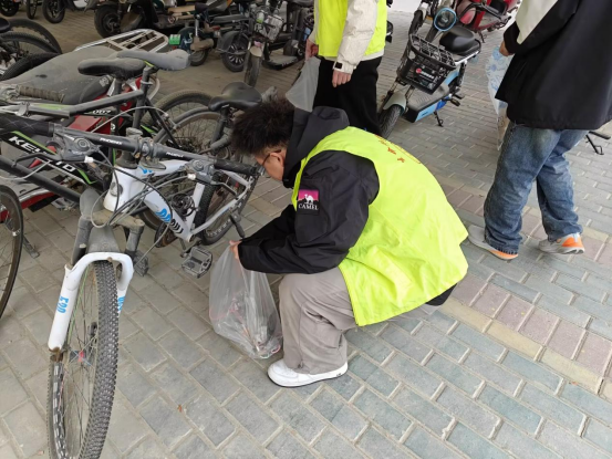 活动开展期间,志愿者分工合作,手持垃圾袋,细致清理车棚各个角落的垃圾,并将停在线外的非机动车辆移至规定线内,对摆放不齐的车辆进行调整。
