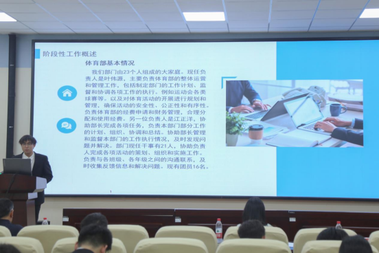 会上,学生会主席团、兼职团委副书记、各部门负责人及社团管理中心代表依次登台,围绕思想引领、组织建设、品牌活动、服务效能四大维度,通过PPT、视频、数据图表等形式进行述职汇报。