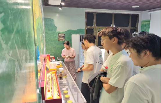 随后,实践团走进麦盖提县生态林展示馆,在防沙治沙中心干部王姣姣的细致讲解下,系统学习当地的治沙技术体系与产业发展模式。在“生态林锁边”“工程治沙”等展区,队员们通过丰富的展板展示,深入了解到治沙人运用网格固沙、飞播造林、节水灌溉等科学手段,实现流沙固定、植被恢复的技术路径,对治沙技术的不断创新与发展表示由衷的赞叹。在梭梭、肉苁蓉等沙生植物培育区,实践团成员们探究了沙生植物从适应沙漠环境的自然育种,经过人工选育、技术赋能,转化为兼具生态固沙功能与经济开发价值资源的全过程,深刻认识到科技在治沙工作中的重要作用。