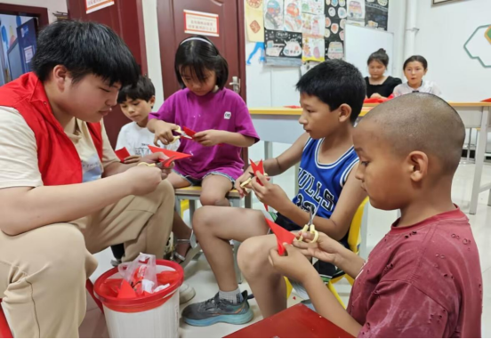 实践团队成员们早早布置好场地,鲜红的彩纸、精巧的剪刀整齐摆放,吸引了众多当地孩子参与。团队成员们首先向大家介绍了剪纸艺术的悠久历史与文化内涵,从古代剪纸的起源讲起,到如今剪纸在装饰、民俗等方面的广泛应用,让大家对这门古老的艺术有了初步认识。