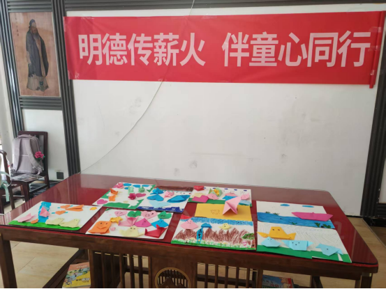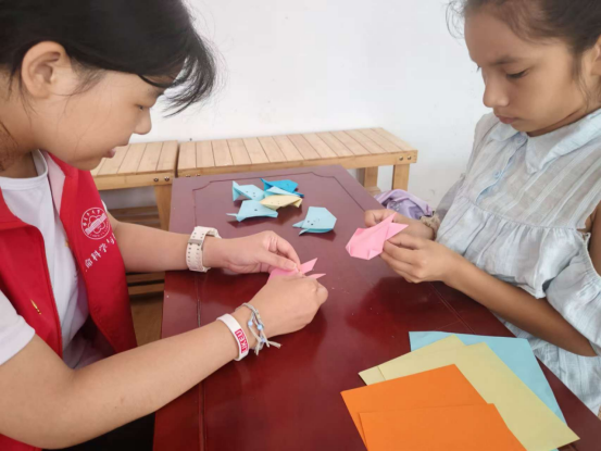 活动伊始,伴童心同行志愿服务团的志愿者们以趣味问答开场,随后,化身折纸老师,分步示范荷花、房屋、树木等折纸技巧,孩子们手持彩纸,认真跟随折叠、翻转、粘贴,不一会儿,色彩缤纷的立体折纸作品便铺满桌面。
