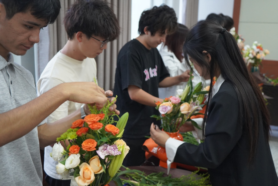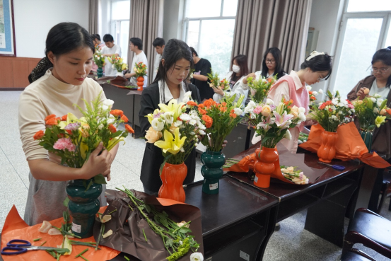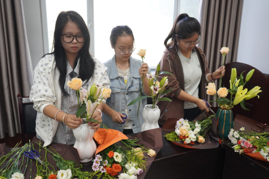 活动现场,花香四溢,温馨而惬意。学院特意邀请了专业花艺师,为同学们带来一场精彩的插花教学。花艺师从花材的选择、色彩的搭配,到造型的设计等方面,进行了细致入微地讲解与示范。同学们全神贯注地聆听,不时提出疑问,与花艺师积极互动。