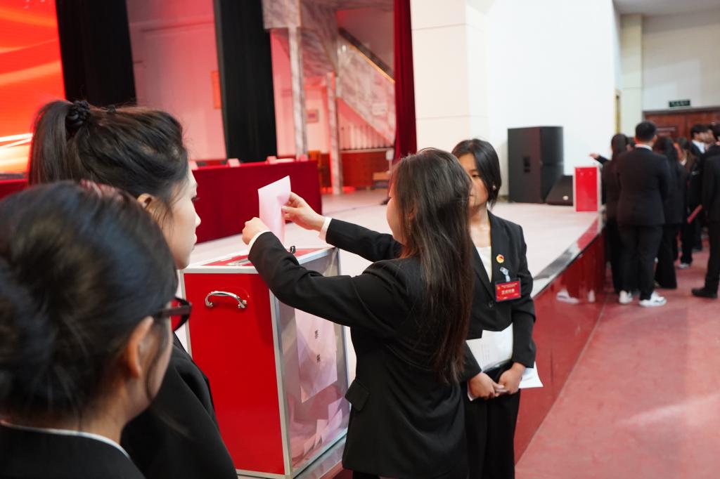 第十一届学生会候选人依次进行竞职发言。与会代表们对候选人依次进行投票选举,在收到工作人员派发的选票后,现场的各位代表严肃地履行代表职责,秉承着对大会负责的态度认真地填写选票。