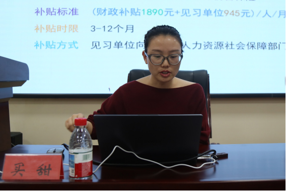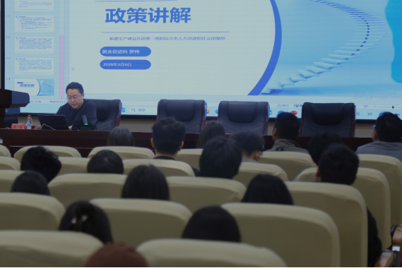 一师人社局就业创业服务科主任买甜作为首位宣讲人,凭借专业且亲和的讲解风格,为大家拉开了政策解读的序幕。她从大学生基层就业政策的出台背景、核心内容等方面入手,以通俗易懂的语言进行阐释。针对同学们关心的基层就业补贴、职业发展路径等问题,让大家对基层就业政策有了初步的认识。