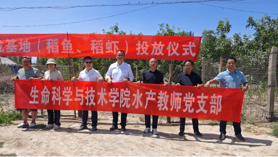水产教师党支部代表任胜杰、宋勇、张旦旦一行,应邀赴阿克苏温宿县新疆鑫盛泷生态科技有限公司水产养殖基地开展稻鱼稻虾综合种养项目精准科技服务。