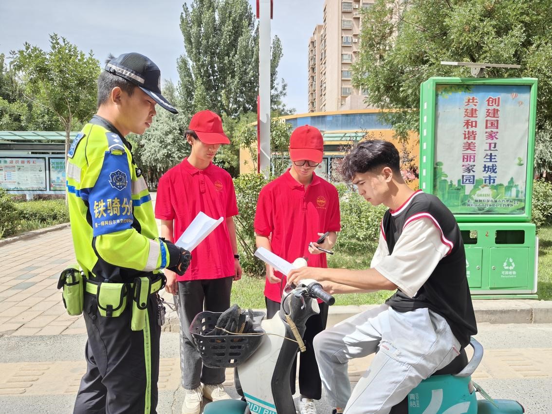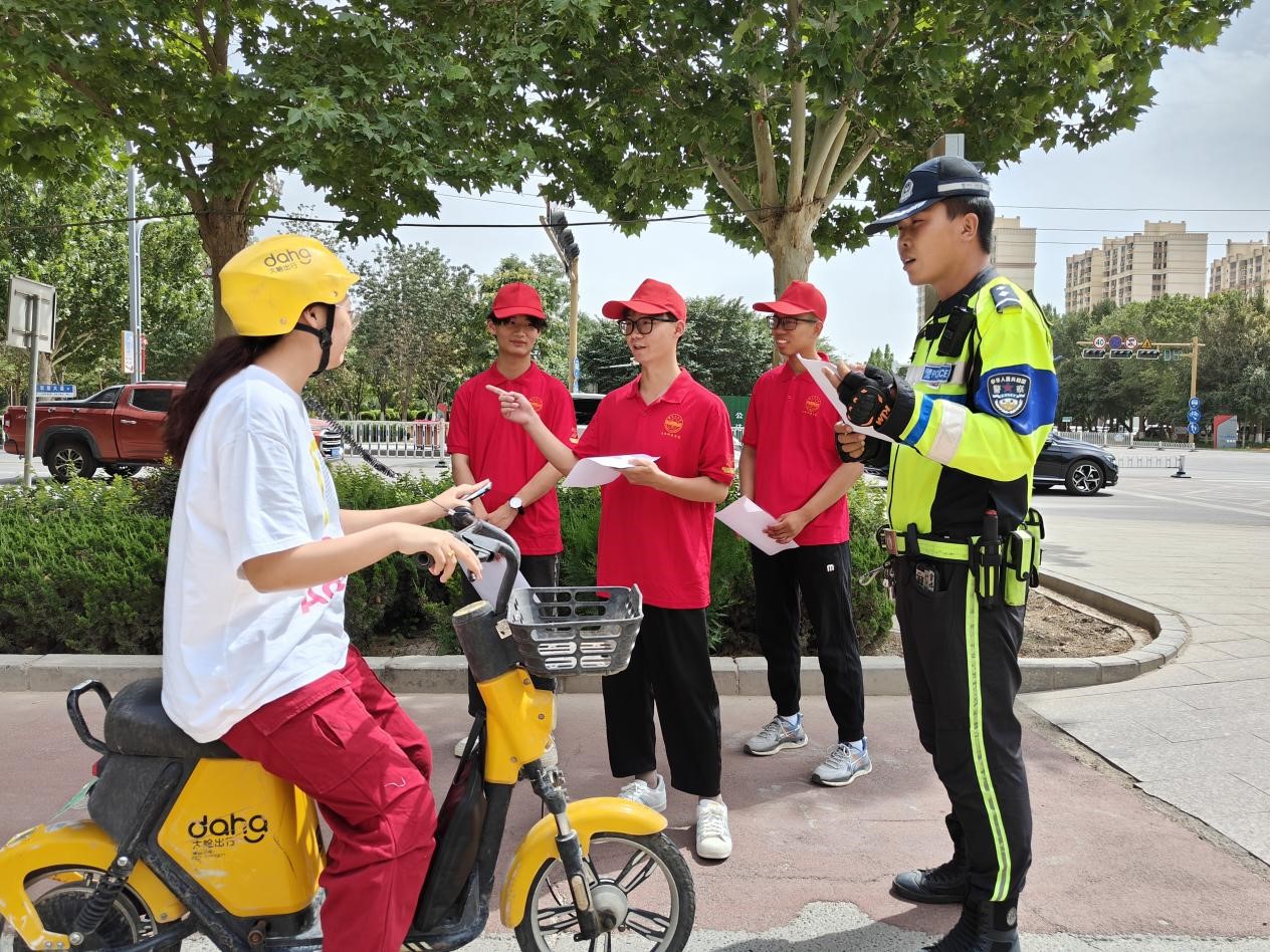 实践团成员向交通执法人员学习了基本的道路交通规则并开展文明出行宣传。劝导过往非机动车驾驶员正确佩戴头盔、不逆行、18周岁以下的未成年人驾驶电动自行车不得载人等,并对违反以上行为的非机动车驾驶员进行现场劝阻教育,签署承诺书,激励市民争做文明交通的践行者。