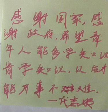 “感谢国家、感谢政府,希望青年人能够多学知识、肯学知识,以后才能万事不难。”代叔叔给同学们说道。