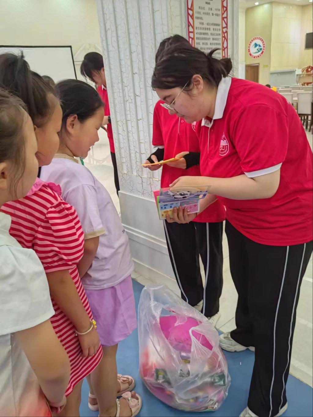 综合楼门前进行了三下乡的启动仪式,会时进行了七个流程其中包括党委书记讲话,党委副书记讲话及优秀学生代表和优秀教师讲话,最后,由党委书记赵光辉同志宣布三下乡活动正式开始。2023年7月7日下午四点,“情暖童心,乡伴同行”团队再次前往阿拉尔市第一师第九团如意社区服务中心与留守儿童进行进一步交流,团队成员们给留守儿童们上了一节关于植物学与动物学的课,通过生命小课堂让儿童们在以后的生活中更加关注自然、喜爱自然,也让他们对自然产生憧憬和爱戴。之后团队成员带着儿童们进行了剪纸活动,让儿童们发挥想象力,通过几张纸、几支笔、一个剪刀绘制出他们的内心的世界,也让他们感受到真正的陪伴。最后,团队成员将购买的物资作为奖励分发给儿童们,鼓励他们在日后的学习生活中更加努力。7月8日至7月10日,团队成员们将收获的材料和各自的想法进行整理和汇总。