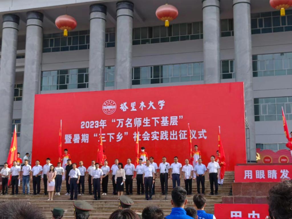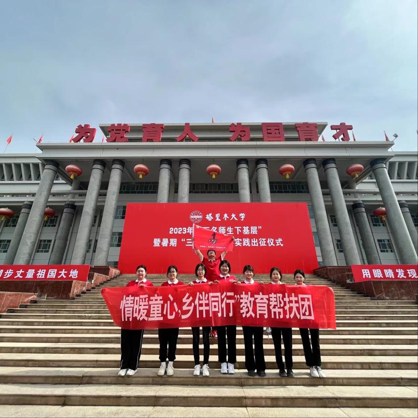 综合楼门前开展2023年“万名师生下基层”暨暑期“三下乡”社会实践出征仪式,大会结束后,“情暖童心,乡伴同行”团队前往第一师第九团如意社区进行对留守儿童的关爱活动。