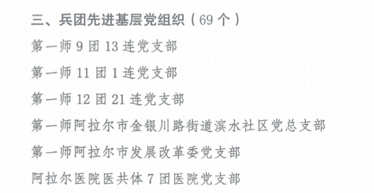 为表彰先进、弘扬正气,进一步激励兵团各级党组织和广大党员干部不忘初心、牢记使命,立足新起点、建功新时代,兵团党委决定,授予薛广录等100名同志“兵团优秀共产党员”称号,授予何彩霞等50名同志“兵团优秀党务工作者”称号,授予第一师九团十三连党支部等69个基层党组织“兵团先进基层党组织”称号。