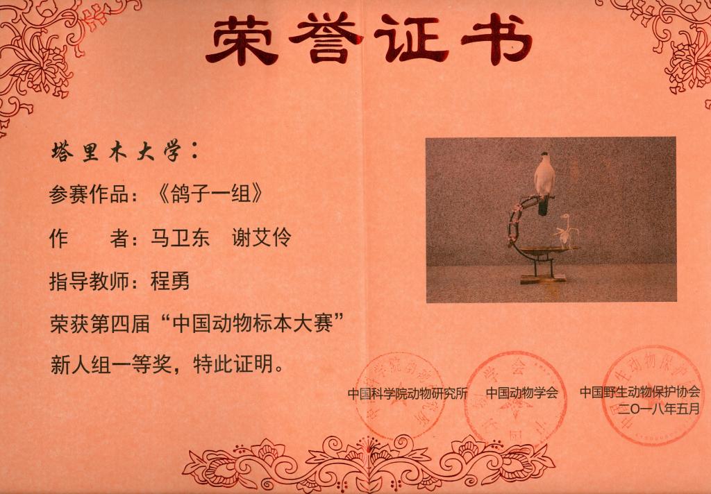 2018年,学生马卫东、谢艾玲制作标本《鸽子一组》获第四届“中国动物标本大赛”新人组一等奖