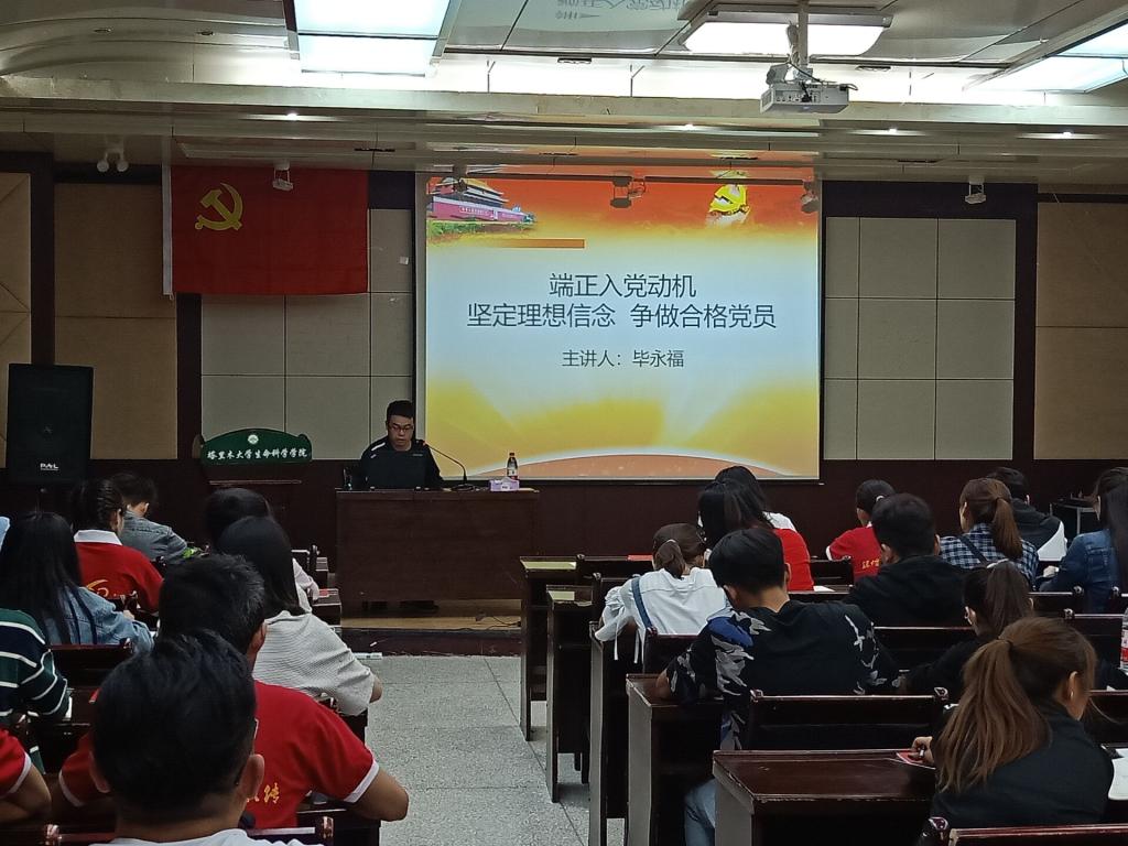 4月26日晚,生命科学学院第65期党训班第三讲在逸夫实验楼501如期进行。学院安排学生办公室辅导员、学生党支部组织委员毕永福为学员们做了一场题为《端正入党动机,坚定理想信念,争做合格党员》的专题辅导。